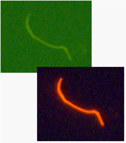 Yang et al.,38 showed a difference in genetic regulation when organisms were grown in BSK II versus BSK-H. For example, the authors showed that organisms grown in BSK-H were more motile and actively replicated, compared to those grown in BSK II. Both pH and temperature were shown to affect expression of genes differently in the two different types of media. They concluded that BSK-H is superior to BSK-II for studies in gene regulation. Advanced Laboratory Services (ALS) uses a blood culture medium modified BSK-H that contains 12% rabbit serum and a collagen matrix as described by.28 The culture media is inoculated with the patient’s blood and both short term (6 days) and long term cultures (8 to 16 weeks) are set up. The 8 week to 16 week culture contains the collagen matrix. The use of this matrix enhances the growth of Borrelia in this artificial laboratory culture medium. The substrate is composed of Rat Tail Collagen Type I with rat tail tendon as the source of the collagen (Cat no. 354557, Corning).39 The cultures are incubated for up to 16 weeks, and are harvested at intervals of 8 weeks and 16 weeks. Organisms attached to and/or growing in the collagen are harvested by scraping the collagen off the slide. Therefore, it is to be expected that some collagen could be visible in the background of stained slides. Collagen shed from the coated slide showed cross-reactivity with the polyclonal and the monoclonal antibody used in the laboratory. Therefore, our goal became to find a substance that bound collagen and generated a background signal at a different wavelength than our labeled antibodies. For this purpose, we used rhodamine fibronectin (RF) from bovine plasma (Cat no. FNR01, Cytoskeleton, Inc.).40 This product has been shown to bind integrins, and ECM components including collagen, fibrin, and heparin sulfate proteoglycans. The fibronectin is modified to contain covalently linked rhodamine at random surface lysines. The positive control used in these experiments was B. burgdorferi B31 ATCC 35210, originally isolated from a tick. Successive passages of control organisms in the laboratory can result in loss of plasmids, chromosomal rearrangement, variation in protein expression and the lack of production or utility of flagella, resulting in non-spiral forms.41 Labandeira-Rey & Skare42 showed that decreased infectivity of B. burgdorferi B31 was related to the lack of linear plasmids 25 and 28-1. The morphology of this control organism is clearly different from that of virulent Borrelia grown from human blood.43,44 Purser and Norris also evaluated plasmids from B. burgdorferi B31 and showed plasmid correlation to infectivity.35 For example, in each of 19 clones, when plasmid Ip28 was absent, the strain was not infective. Infectivity has been correlated to motility, and hence periplasmic flagella, which convey the spiral shape. Also, both adhesins and invasion factors are carried on plasmids and may be lost by the organism.41,45,46
