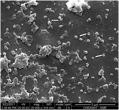 Figure 1 Microphotograph showing nitinol surface inoculated with Mycoplasma spp and incubated in a culture medium containing horse serum for 5 days. Note the coccoid forms (c) and coccoid forms initiating reproduction (fr) (Orig. Mag: 20000X).