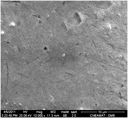 Figure 2 Microphotograph showing nitinol surface inoculated with Mycoplasma spp and incubated in human serum-containing medium during 5 days. Note growth in multilayers (Orig. Mag. 10000X).