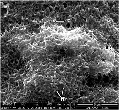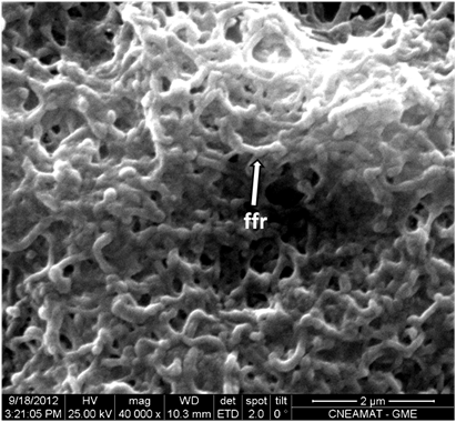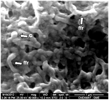 Figure 4 At higher magnification. A predominance of filamentous forms undergoing reproduction (ffr) and of coccoid forms (c) of Mycoplasma spp. can be observed (Orig. Mag: 20000X).
