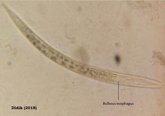 The self-collection of direct urine sample was taken by probandus in boarding house about 15 to 30 minutes before go to campus. The probandus were female students who took the course of Biomedical 1. Each female student is required to take direct urine for practicum specimens. A 10 ml urine sample was poured into a centrifuge tube and rotated at 2500 rpm for 10 minutes. The sediment and supernatant of the urine was separated. Two drops of sediment was taken and prepared in the object glass slide to be examined microscopically to finding of adult, larva or egg of E. vermicularis worm with gradual magnification.9 We found larvae worm (Figure 1) in the urine sample. There are no other intestinal worms that can migrate to the genital organs.10 E. vermicularis is the one species may to migrate to the female genital organs due to the anatomical position of the anus and adjacent genital holes.2-4 The microscopic images of larvae in this finding indicate the presence of an esophageal bulb. The esophageal bulb is a specific feature of E. vermicularis.11 No other morphological features are more specific. The behavior of female worms laying eggs in the perianal,12 larvae migration behavior,10 and the existence of several reports of cases of genital infection1-8 reinforces this suspicion. The hatched larvae will enter into the rectum11 or migrate to the genital tract in women.13 No other species of intestinal nematode were migration reported in the genital tract. Its means, only this species can migrate to the genital tract. Finally, we concluded that this larvae is E.vermicularis worm.