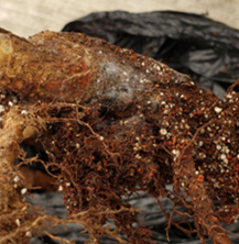 An approximate of 12x106 spores and 3.8x106 ascospores were estimated in the 5g of inoculum per root. Groups A and B, in contrast to groups C and D, which were not added, were the only ones that showed mycelial growth, suggesting that the indole-3-butyric acid present in the inoculum indirectly favors mycelial development, since this hormone does not act directly on Tm; its function is exercised in the roots of the plants, favoring an increase in their metabolic activity, which in turn can supply more and better nutrients to the mycelia associated with Tm. The results of Group A show a Tm mycelia formation of approximately 11cm in length, as can be seen in Figure 1. Group B presented a mycelia formation of approximately 4.5cm, as can be seen in Figure 2, which represents a difference of 59% greater growth in Group A, with respect to the mycelia formation presented by Group B. This could be due to the fact that Group B did not have a sterilized substrate, and could have less availability of nutrients due to competitiveness with microorganisms or other fungi present in the substrate.1-45