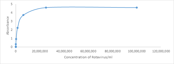 The use of Lateral flow test kits can result in misdiagnosis of rotavirus due to their relatively poor sensitivity compared to the conventional sandwich ELISA technique. The ELISA technique is sensitive enough to pick 381.5 rotavirus particle per ml in a sample unlike LAT which detected the presence of rotavirus at the concentration of 1,562,500 particles per ml. Furthermore, the study has also shown that the absorbance is exponentially proportional to the rotavirus antigen present in the sample until a steady state is attained due to antibody-antigen saturation. The equation Y=3.8753x + 1.4236 can be employed to find the unknown concentration of rotavirus antigens when the absorbance is known.