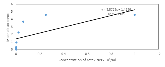 Data obtained from ELISA methods were analysed statistically using Microsoft excel and the spearman test was used to analyse the linear relationship between the absorbance and concentration of rotavirus expressed in number of rotavirus particles per ml. The concentration of rotavirus was calculated by dividing the initial concentration of rotavirus (1.0 ×108/ml) by 4 to obtain the next concentration and so on until the last concentration was established.