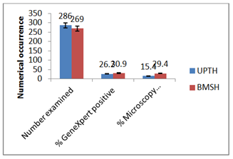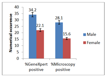 The 555 sputum samples collected from the two hospitals were assayed for the presence of MTB using both microscopy and GeneXpert assay method. Nevertheless, GeneXpert assay was able to detect 26.2% and 30.9% MTB positive samples in the UPTH and BMSH samples respectively, while microscopy detected 15.4% and 29.4% MTB positive samples respectively. Among the seven age groups investigated, ages 30-39 had a higher sample size of 171 and next to it were ages 40-49 while persons less than 10 years had lowest sample size of 21. GeneXpert identified 33.3% MTB samples among 30-39 age groups while it identified 9.5% MTB positive samples among ≤10 age group. Microscopy identified 25.1% and 4.8% of age group 30-39 and ≤10 respectively. Among males 34.2% and 28.1 was detected using GeneXpert and microscopy, respectively. Among females, 22.1% and 15.6% MTB positive samples was detected using GeneXpert and microscopy, respectively (Figure1 & 2) (Table 1).