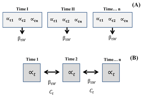 Figure 1 (A) Proposal to measure diversity within temporal sampling unit, where each t represents a subunit of the temporal sample (e.g. day), and (B) proposed by Moreno & Halfter (2001) to measure the diversity between habitats (here, temporary units). Α, alpha diversity; t, subunit of the temporal sample (n); , temporary beta of a unit of time; Ct, temporal complementarity.