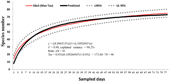 74 species of birds were recorded, of which 25 are new records for the northern coastline of Tuxpan, nine for northern Veracruz and three for the coastal plain of the Gulf of Mexico (Eudocimus ruber, Larus glaucocescens y Streptoprocne semicollaris) (Table 1). The Clench model suggests that the expected richness could increase to 81 species, so 91% of the richness has been recorded (Figure 2).