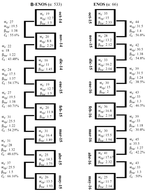 Figure 3 Values of , , and within and between the months that compose the winner season before and during the ENSO. B-ENOS: before el niño oscillation south and ENOS: el niño oscillation south.