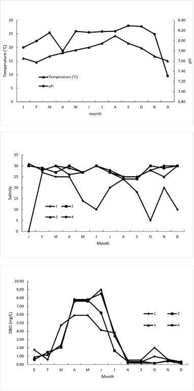 The temperature and pH were similar for the four sampling stations. Data were averaged each month. The temperature was lower in the winter months (15°C) and increased for the summer months, being august the month with the highest temperature (24°C). The average pH was 7.31 to 8.29; only station one had the lowest pH of 6.80 in the month of December (Figure 2a). Salinity was similar in three sampling stations except for station one, which receives a significant contribution of wastewater, registering from 0 to 27. While the minimum salinity for the rest was 24 and the maximum was 30 (Figure 2b). DBO had the highest concentrations in the months of April to June. Station 3 had the maximum with 9.02 mg.L-1 in June, while the minimum was recorded by station 2 with 0.13 mg.L-1 (Figure 2c).