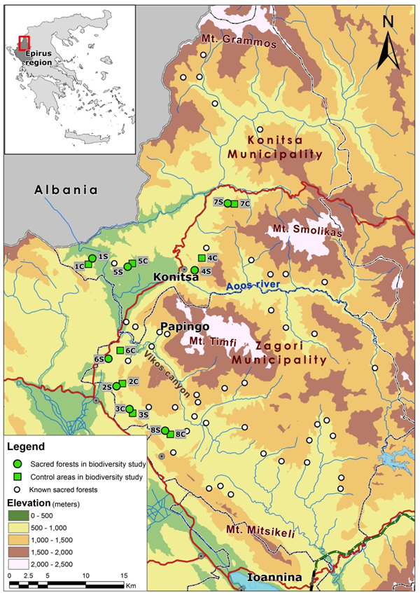 The present investigation was conducted in the mountains of the municipalities of Zagori and Konitsa in the region of Epirus (NW Greece) near the Albanian border (Figure 1). Sacred groves in this area have been indentified in the majority of the 80 villages of the area as a result of long-term ethnographic research. Research sites were selected from the extended network of sacred groves occurring there based on historical management and ecological criteria.13