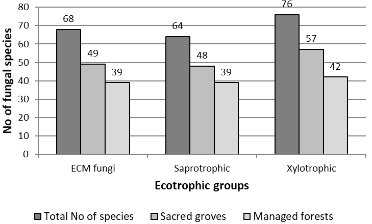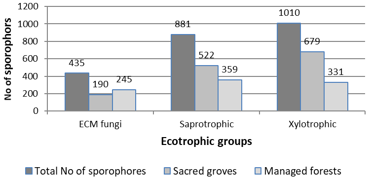 It was found that when all site data were combined, sacred groves appeared to shelter a higher incidence of macromycete species and a higher yield of sporophores supporting the null hypothesis. When, however, the ecotrophic groups were compared individually the picture was slightly different.