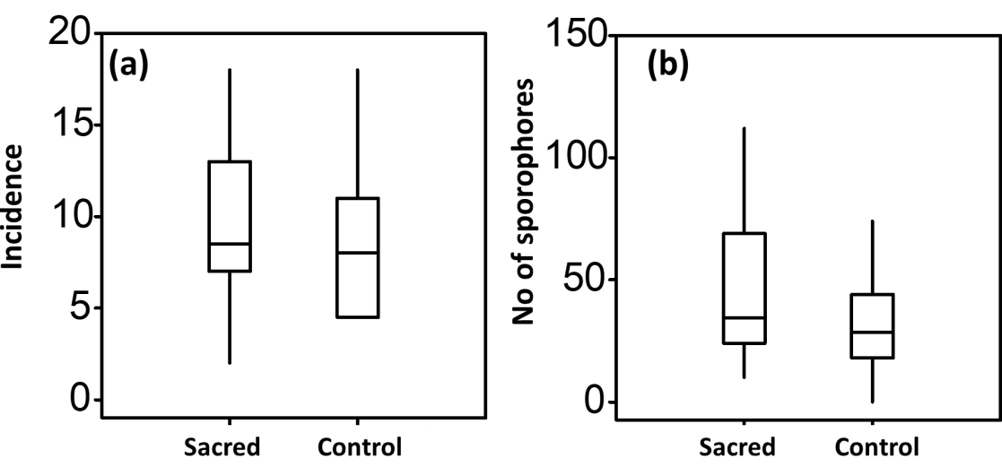 Figure 4 Range, medians and population variability (quartiles) for the (a) incidence of fungal species (mean for the sacred plots was Meansacred=9.8±1.1 and mean for the control plots was Meancontrol=8.1±0.8) and for the (b) number of sporophores (mean for the sacred plots was (Meansacred=48.3±7.4 and mean for the control plots Meancontrol=32.7±4.7).