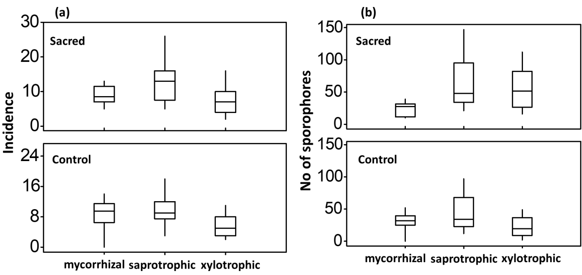 Figure 5 (a) Range, medians and population variability (quartiles) of the three ecotrophic groups recorded in sacred and control plots. Mean incidence for sacred plots was 9.00±1.0, 13.00±2.4 and 7.5±1.6 for ECM, saprotrophic, and xylotrophic fungi, respectively. Mean incidence for the control plots was 8.62±1.6, 9.7±1.6 and 5.9±1.07 for ECM, saprotrophic, xylotrophic fungi, respectively. (b) Range, medians and population variability (quartiles) of the three ecotrophic groups recorded in sacred and control plots. Mean number of sporophores recorded in sacred plots was 23.7±4.0, 65.2±15.7 and 56.0±12.1 for ECM, saprotrophic, xylotrophic fungi, respectively while the mean number of sporophores recorded in the corresponding control plots was 30.6±5.6, 44.9±10.5 and 22.6±6.1.