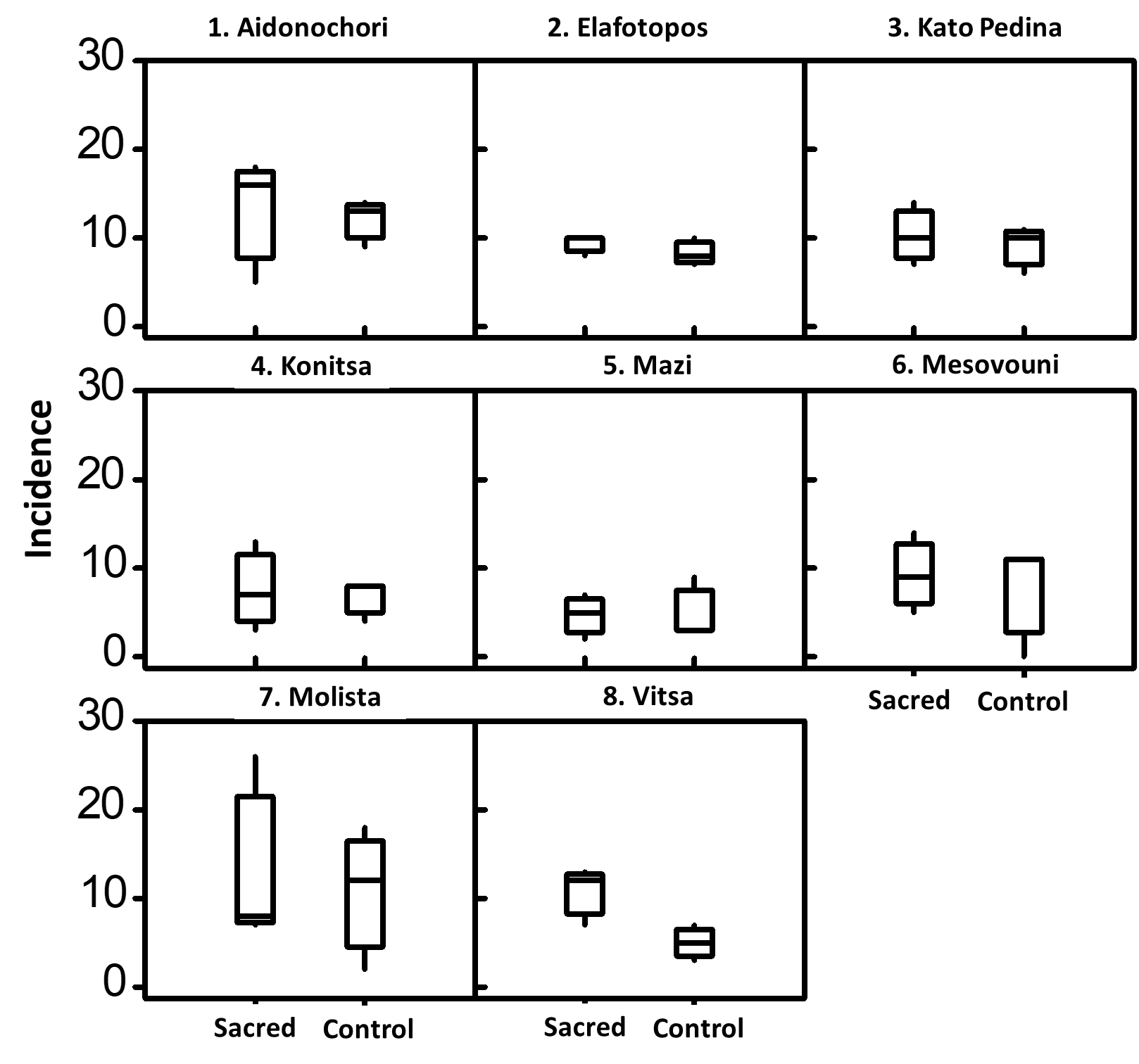 Figure 6 Distribution of the incidence (number of fungal species) across the examined sites. Boxplots show the range, medians and fungal variability (quartiles) between control and sacred plots within each examined site.