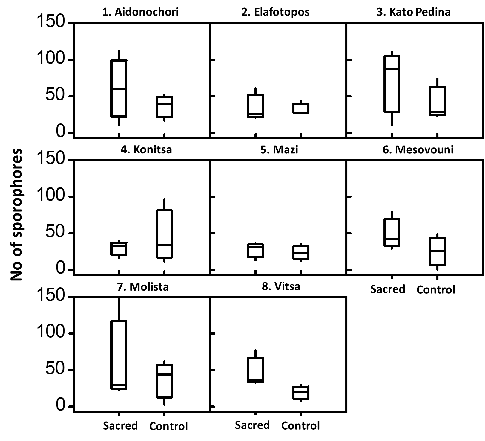 Figure 7 Distribution of sporophores across the examined sites. Boxplots show the range, medians and fungal variability (quartiles) between control and sacred plots within each examined site.
