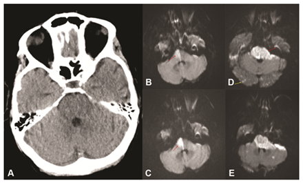 (D & E) demonstrate 3 days later after patient progressed to coma and impaired brainstem reflexes widespread basilar artery territory infarction and scattered diffuse changes in occipital lobes (peripheral) arrow in E which was a higher slice than D.