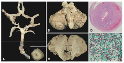 Clinical presentation of CNS fungal infection varies from meningitis, meningoencephalitis, stroke, cerebritis, and vasculitis to venous sinus thrombosis.1,9 CNS fungal infection is difficult to diagnose because of the paucity of laboratory tests for it and its nonspecific imaging and clinical features. The low rate of fungal isolation from CSF specimens can also confound the diagnostic accuracy in these patients.2 Clinical features of fungal meningitis and meningoencephalitis are usually reported as headaches, fever, nausea, vomiting, visual impairment, papilledema, seizure, and acute mental status changes.1 Similar findings were noted in our patient population, with headache being the most common initial clinical presentation. Patients often presented with more than one complaint, not always localized to the CNS. Cerebral vascular accident or stroke-like symptoms such as limb or facial weakness, slurred speech, gait abnormality, or ataxia were collectively the second most common clinical presentation in our patient population. One of the cases was a 68 year old female with high-grade myeloproliferative disorder with acute myeloid leukemia who presented with acute stroke symptoms of hemiparesis, followed by respiratory failure, and stupor. Initial imaging with noncontrast head CT (Figure 1A) showed no acute hypodensity. Subsequent MRI imaging (Figure 1B-1E) showed progressive vertebrobasilar vasculitic infarction of the right pons followed 3 days later by bilateral posterior circulation infarction. LP fluid was negative for fungal organism but autopsy was definitive of fungal progressive invasion of the basilar artery and circulation (Figure 2A-2E).