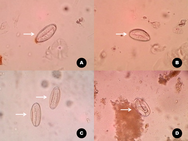The morphology of the eggs was found according to microscopic characteristics with a typical asymmetrical oval shape. The egg wall is composed of thin transparent hyaline material that looks double. All the eggs contained embryos to larvae in a uniquely beautiful shape (Figure 1).