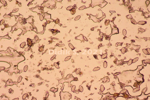 Eggs of E. vermicularis with an average of 45 eggs per small visual field were dense and filled the entire visual field of microscopic observation. This view is the case with the highest degree of infection (Figure 2).