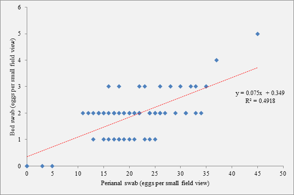 The existence of a significant relationship between the incidence of enterobiasis in children and the presence of worm eggs on bedding is easily understood. This means that worm eggs can be spread on bedding only if the user has enterobiasis. The logic of the existence of sufferers causes the presence of worm eggs, of course, it is undeniable. The R square = 0.4918 means that the distribution of E. vermicularis eggs on the bed is supported by 49.18% by the incidence of enterobiasis in children, the rest is influenced by other factors. Other factors that need to be observed in further studies include perianal scratching behavior, children's sleeping habits, finger sucking habits, and other variables related to the sanitation of children's bedrooms.