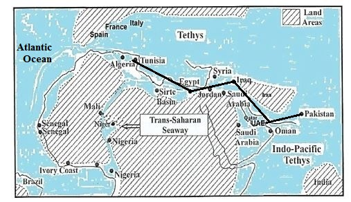 Figure 1 The Late Cretaceous-Early Paleocene paleogeographic map of the Southern Tethys (Tunisia, Egypt, Iraq, UAE, Pakistan), showing possible migration routes of the members of the twelve diagnostic benthic species.37