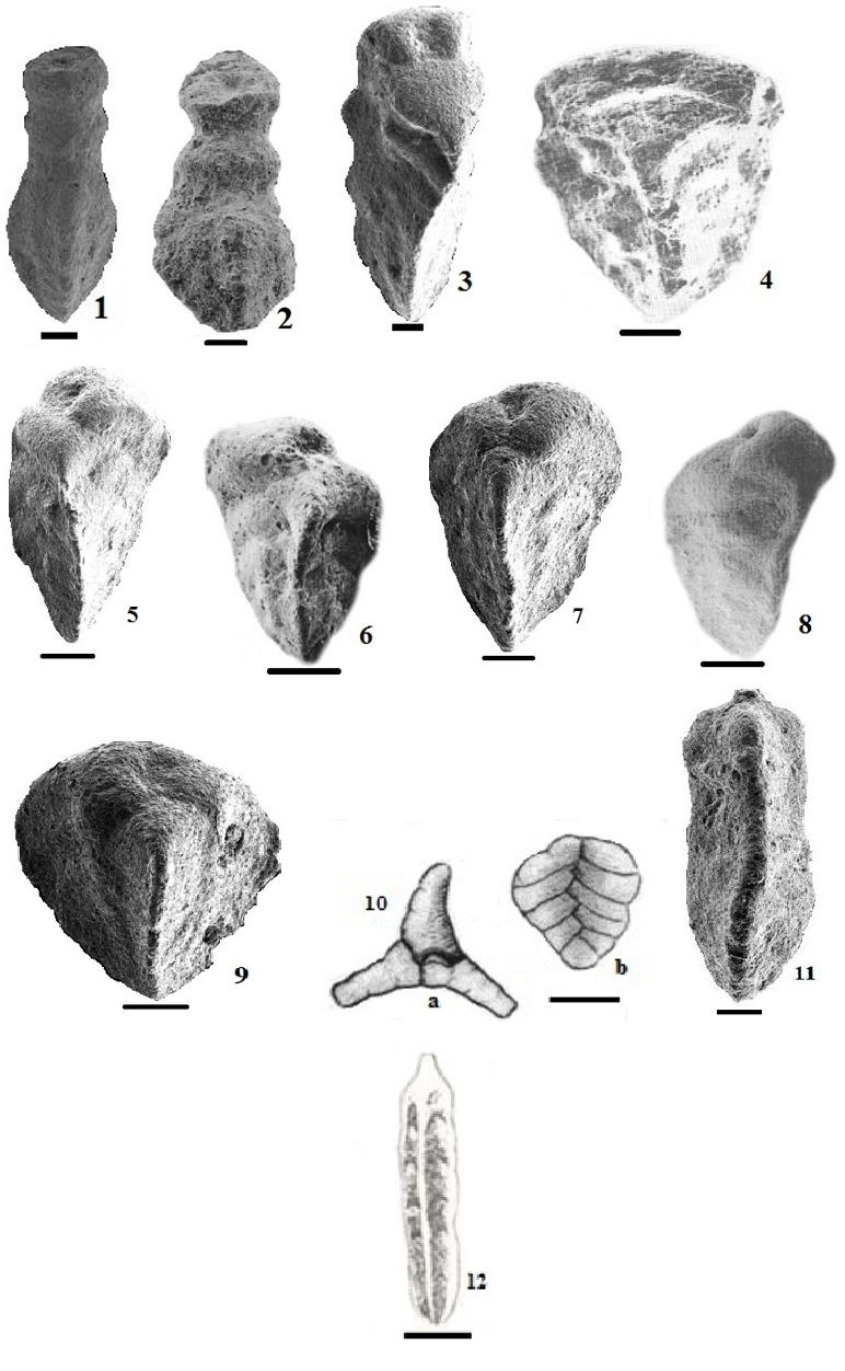 Plate 1 Pseudoclavulina farisi Anan (n. p.), 2. P. hewaidyi Anan (2008), 3. Gaudryina acuta Anan (n. p.), 4. G. limbata Said & Kenawy (1956), 5. Gaudryina jaffi Anan (n. p.), 6. G. ameeri Anan (2012), 7. Gaudryina lawai (Anan, n. p.), 8. G. speijeri (Anan, 2012), 9. Vernuilina iraqensis (Anan, n. p.), 10. V. luxorensis Nakkady (1950), a. apertural view, b. side view, 11. Tritaxia longa Anan (n. p.), 12. T. elongata (Haque, 1956).