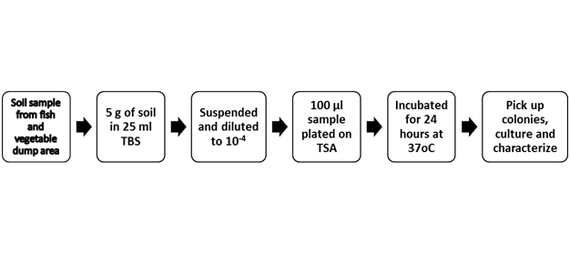 Soil around fish and vegetable waste dump area is an excellent environment for microbial growth due to abundant supply of organic material. In addition, warm temperature in Bangladesh favors bacterial growth. Hence we have selected and studied bacterial population in different food waste dumping area of Dhaka city. Soil samples were collected from fish and vegetable waste dumping area of Dhaka city. Soil samples were suspended in PBS and diluted to 10-4. A portion of diluted liquid was spread on to TSA plates. Bacteria were allowed to grow in a 37oC as shown in a sketch of procedure (Figure 1). After 24 hours of incubation, growth of bacteria was studied. Bacterial colonies were identified based on their color and morphology (data not shown). Single colonies were picked up and cultured in TSB for further analysis. Bacteria observed in this study were of different types as observed by morphology, color, and edge of colonies. The result obtained in this study is consistent with the previous reports.20,21