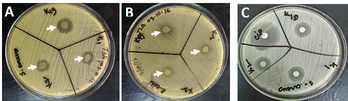 Figure 2 Bactericidal activity of soil bacterial isolates. Each of the bacterial isolates (K1, K2, and K19) were studied for their ability to produce bactericidal chemicals. S. aureus (A) or E. coli(B)cultures were inoculated on TSA plate by spreading with cotton swabs. A small amount of bacterial isolate was then spot inoculated on indicated position. TSA plates were then incubated for 24 hours and studied for the ability of soil bacterial isolates to inhibit growth of S. aureus(A) and E. coli (B). Clear zone (shown by arrow) was measured. C. Inhibitory effect of culture supernatant. Bacterial isolates (K1, K2, and K19) from soil samples were cultured in TSB for 24 hours. TSB culture was centrifuged at 12 krpm for 30 min. The supernatant was collected and filtered through 0.22 µm filter. About 50 µl of filtrate was soaked onto 3MM paper discs. Discs were applied onto pre-inoculated S. aureus TSA plate. The plate was incubated at 37oC overnight and studied for antibacterial activity. Arrows show clear zone where S. aureus did not grow. Ciprofloxacin (5 µg per disc) used as a positive control.