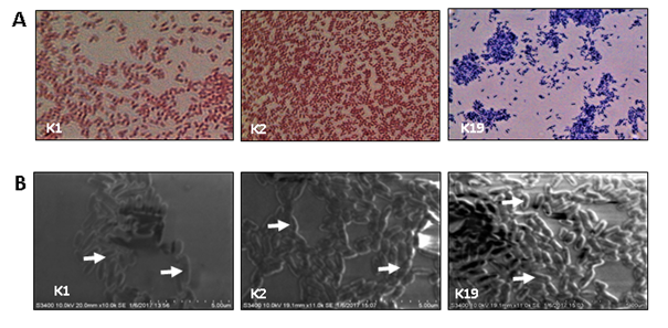 B. Bacterial isolates (K1, K2, or K19) were spreaded on a small cover slip. Morphology of bacteria was studied under a scan electron microscope and images were captured. Arrow shows position of individual cell.
