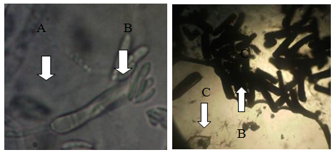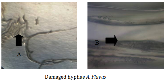 Figure 1b Damaged hyphae of A. flavus (A and B) under photomicroscope (HPO).