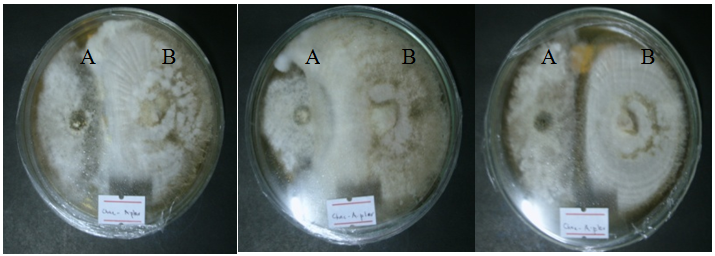 Co-culture method: The C. cellulolyticum was tested to determine if this fungus could colonize the agar lawn of A. flavus using co-culture method as shown in Figure 2. The area and the percentage colonization of C. cellulolyticum and the pathogen were recorded at 30 days as shown in Figure 3. The results indicated that A. flavus ramified faster than C. cellulolyticum as shown in Figure 3. A. flavus colonized by 4,234.33 mm2 or 52.28% the agar lawn of C. cellulolyticum at 30 days and first crossed the midline. It is clearly observed that there was no colonization of C. cellulolyticum on agar lawn of A. flavus. On the other hand, the C. cellulolyticum colonized by 2,566 mm2 or 31.68%. Results showed that, C. cellulolyticum was grown slowly, similarly as what Soytong15 said that Chaetomium spp. is a slow growing fungus compared to pathogens, and the growth and development is at 25 to 30 days.
