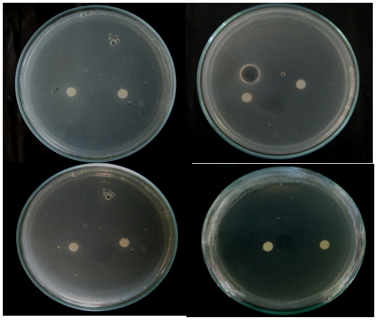 Antimicrobial bioassay: The mycelia of C. cellulolyticum were extracted using Hexane and Ethanol extractions. This method was done to determine the presence of inhibitory effect of C. cellulolyticum extracts on the mycelial growth of A. flavus. Table 1 shows the mean diameter of zone of inhibition of all the treatments. Results revealed that at 24th to 48th hours of incubation see Figures 4 & 5, mycelial crude hexane and ethanol extracts do not produced zone of inhibition on A. flavus. Statistical analysis showed that the zone of inhibition of the two crude extracts were comparable to the positive and negative control. However, at 72nd to 96th hours, the extracts were significantly smaller to the positive control and comparable to the negative control see Appendix I & J. The affectivity of the mycelial crude extracts was not observed at 24th to 96th hours may because of the little amount of bioactive compounds found in the crude extracts. The active components capability may also have short time effect to control the pathogen or the crude extracts were diffused across time in contrast to the report of Soytong et al. 15 that substances extracted from Chaetomium spp. could exhibit activity towards some pathogens.