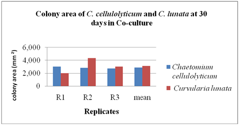 Figure 3 The colony area of C. cellulolyticum and A. flavus per replicates at 30 days in co-culture.