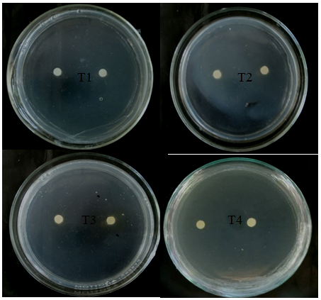Figure 4 Zone of Inhibition exhibited by all the treatments against A. flavus at 24th hours of incubation. (T1- crude hexane extract, T2- crude ethanol extract, T3- positive control (Dithane), T4- negative control (DMSO).