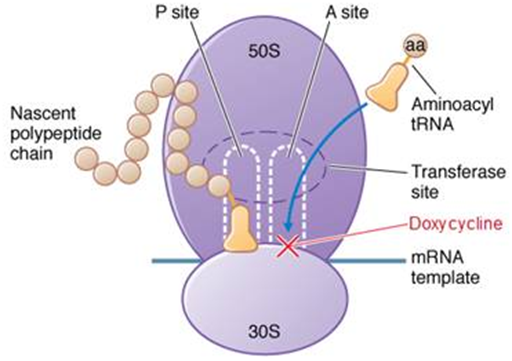 Figure 1 Mechanism of action of doxycycline: once inside the cell doxycycline binds to the A site on the 30S subunit of the microbial ribosome. During protein synthesis, a new tRNA with an amino acid attempts to bind to the A site of the ribosome, but cannot due to the site being blocked by doxycycline. Without the attachment of the aminoacyl tRNA to the A site protein synthesis is inhibited and cell death follows.