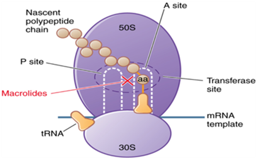 Figure 2 Mechanism of action of erythromycin: erythromycin penetrated the cell membrane and reversibly binds to the 50S subunit of the bacterial ribosome near the P site so than binding of tRNA to this site is blocked. Translocation of peptides from the A site to the P site is prevented, and subsequent protein synthesis is inhibited.