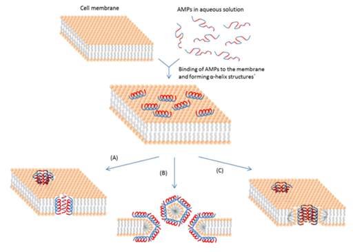 (A) demonstrates the barrel-stave mechanism: peptides associate to form a bundle of α-helices embedded in the membrane to form a membrane pore.