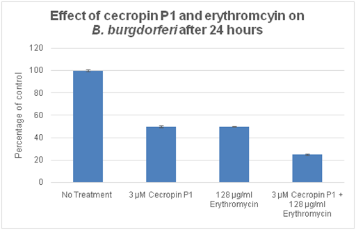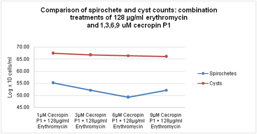 Doxycycline decreased spirochete growth at the optimal concentration of 64µg/ml, but the same concentration of erythromycin was significantly more effective. The antimicrobial peptide cecropin P1 had little effect on spirochete growth when used individually, but when combined with antibiotics produced greater inhibitory effects than the antibiotics alone. A statistically significant synergistic effect was seen when 6µM cecropin P1 was combined with 128µg/ml erythromycin (P<0.05). This treatment was the most effective treatment against spirochetes among all of the testing conditions (P<0.01). This treatment also significantly reduced cyst concentrations (P<0.01).