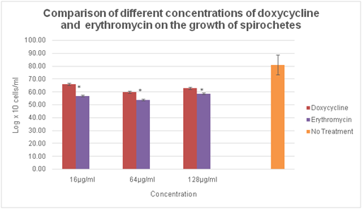 Experiment 1– Doxycycline, Erythromycin, and Cecropin P1: Doxycycline, erythromycin, and cecropin P1 were added to a set of 2 ml culture tubes containing spirochetes at a concentration of 1 x 105 cells/ml, loosely capped, and incubated at 34 °C with 5% CO2. Concentrations of doxycycline, erythromycin, and cecropin P1 were chosen based on previously published minimum inhibitory concentrations (MICs) and minimum bactericidal concentrations (MBCs),8,32,51,52 (Table 1). Table 2 summarizes the different treatments.