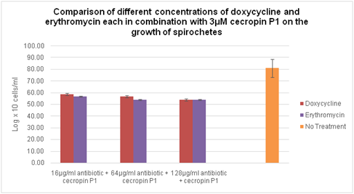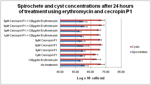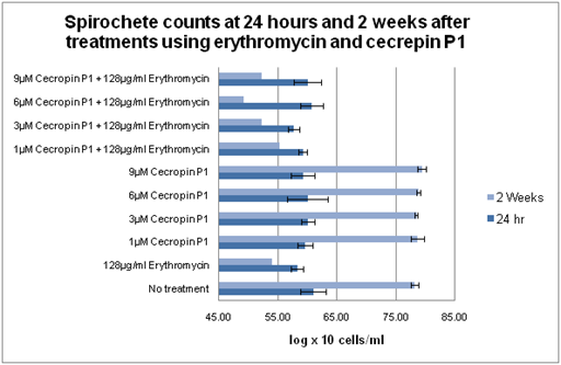 The foundation experiment involved the comparative effects of doxycycline and erythromycin on growth of the organism. Both of these antibiotics disallow proper protein formation on the ribosome. The difference is that erythromycin is active against intracellular pathogens such as Mycoplasma that may give it an advantage with spirochetes and/or cysts. Concentrations of antibiotic were chosen to mimic achievable levels in serum, 16, 64, and 128μg/ml. Doxycycline and erythromycin were combined with 3μM cecropin P1 and spirochete counts were obtained after 24 hours and 2 weeks. The shorter time frame would be an indication of antimicrobial efficacy and the 2–week timeframe would measure peptide and/or combination effectiveness. Both of these assumptions are based on the half–lives of the components. Cecropin P1 was isolated from bovine cells and would not be ideal for use in the human. Due to its ease of procurement, low cost, and benchmark MIC of 3μM for E. coli, it was chosen for use in the initial feasibility phase of these experiments.