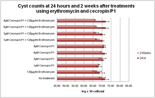 Most tubes displayed a decrease in cyst concentration at the 24–hour time point with the exception of 1µM cecropin P1 and 9µM cecropin P1. It is of note that the cyst concentration in tubes treated with 1µM cecropin P1 was still lower than the cyst concentration in the control. This was not true for 9µM cecropin P1. Erythromycin/cecropin combination treatments had significantly lower cyst concentrations than cecropin P1 alone at concentrations of 6µM and 9µM (P<0.01). These combination treatments also had lower cyst concentrations than erythromycin alone, but this observation was not statistically significant. The greatest decrease in cyst concentration was seen with the combination treatments involving higher concentrations of cecropin P1 (Figure 9). Erythromycin alone reduced cyst concentration by ~49% while 6µM cecropin P1 alone reduced cyst concentration by ~13%. However, when the two therapies were combined they reduced cyst concentration by ~57%.