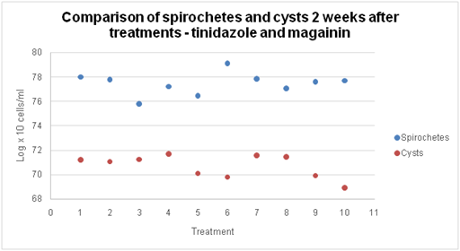 Table 9 Results of Experiment 4 – treatment with high levels of tinidazole. Spirochete and cyst counts after 24 hours and again at 2 weeks