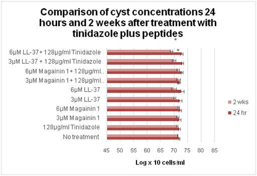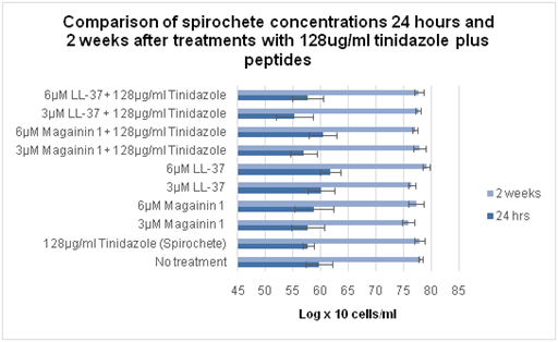 The antimicrobial peptide magainin –1 had little effect on spirochete or cyst concentrations of B. burgdorferi. The peptide LL–37 was not effective against spirochetes, but was effective against cysts. In addition, combination treatments involving tinidazole and LL–37 had slightly lower cyst concentrations than either individual treatment. A significant synergistic effect was demonstrated when 6µM LL–37 was combined with 128µg/ml tinidazole (P<0.02).
