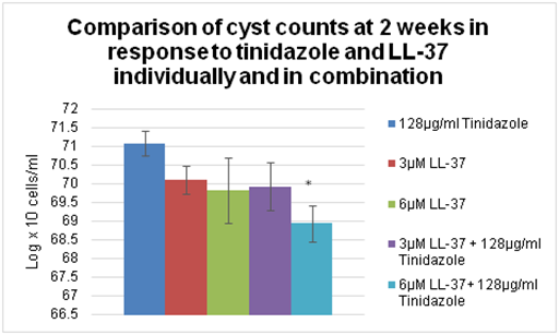 Figure 16 Comparison of cyst concentrations, in log x 10 cells/ml, of B. burgdorferi 2 weeks after treatment with tinidazole and LL-37 individually and in combination.