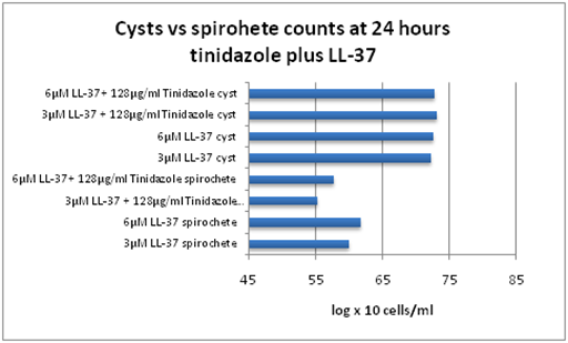 The next compounds chosen for use were tinidazole at 128μg/ml plus antimicrobial peptides magainin–1 and LL–37 at 3 and 6μM. This phase of experimentation sought to mimic what could possibly be used safely in the human as both magainin–1 and LL–37 are human–derived peptides. These were tested for efficacy against both spirochetes and cysts in triplicate. Tinidazole has been used as one of the components of combination therapy for treatment of Borrelia and reports have shown its effectiveness against cysts.
