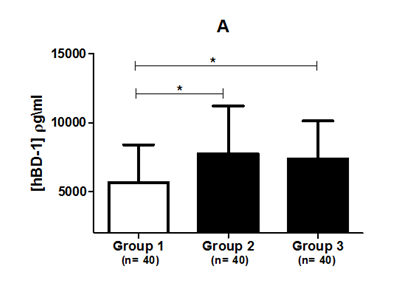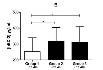 Figure 1 (A) Salivary hBD-1 concentration. (B) Salivary hBD-2 concentration in three different groups based on their periodontal status.