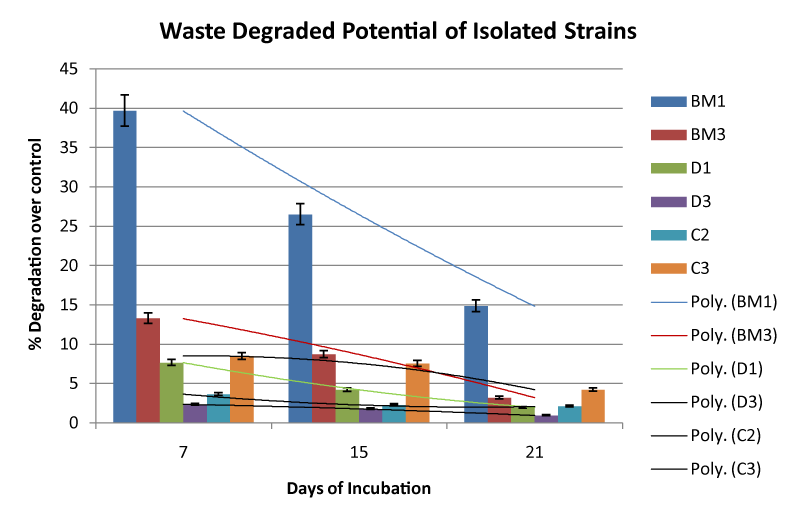 Protease enzyme has vast application in degradation of waste. Thus the 6 strains capable of producing protease enzyme were subjected to waste degradation efficiency test. In our study it can be observed that BM1 has the highest degradation potential followed by BM3. BM1 is also a potent protease enzyme producer thus it possess better degradation ability too (Figure 1). As the waste is break down by microorganisms (bacteria), weight of the litter decreases. In the present study of decomposition, we observed that the weight of treated litter decreased because bacteria broke it down and converted it to simple molecules. Percentage of weight loss of waste samples were increased with the progression of decomposition process as can be seen in Figure 1. Similar observation was reported by Zaved et al.,25 on weight loss study of garbage by specific bacteria in Bangladesh. In our study it can be observed that BM1 has the highest degradation potential followed. Thus BM1 can be efficiently used for bioremediation of solid waste.