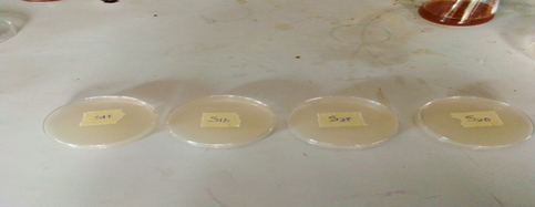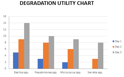 From the morphological and microscopic characteristics, four oil degrading bacteria isolates; Bacillus species, Pseudomonas species, Micrococcus species and Serratia species were taken for culture in nutrient agar containing 1ml of engine oil by streaking method for degradation studies and were allowed to undergo degradation of engine oil for 3 days. The degradation of oil was examined according to the bacteria growth from day 1-3. The results were shown in the table below (Table 6).