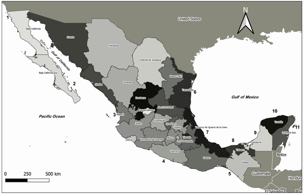Abbreviations: Ocean: GM, Gulf of México; P, Pacific Ocean; GC, Gulf of California; C, Caribbean. México States: BC, Baja California; BCS, Baja California Sur; CHP, NAY, Nayarit; GRO, Guerrero; CHP, Chiapas; TAM, Tamaulipas; VER, Veracruz; CAM, Campeche; TAB, Tabasco; YUC, Yucatán; ROO, Quintana Roo