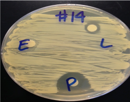 Bacterial isolates were screened using the disk diffusion disk method to determine their sensitivity to ampicillin (10ug), penicillin (10ug), novobiocin (22ug), chloramphenicol (30ug), and doxycycline (30ug) (BD BBL Sensi-Disc; Becton Dickinson and Company, Sparks, MD). The diameters of the zones of inhibition were measured and breakpoints calculated for each antibiotic in accordance with the standards recommended by the Clinical Laboratory Safety Institute.13 Peppermint oil (PO) (100%), Lavender oil (LO)(100%), and Eucalyptus oil (EO) (100%) were purchased from Whole Foods Inc. (Paramus, New Jersey). Disks were soaked into each solution and placed on the growth media previously inoculated with bacteria. Muller Hinton Agar (MHA) was used as the growth media in accordance with the standards recommended by the Clinical Laboratory Safety Institute.13 S. aureus obtained from Ward Scientific was used as a quality control strain. The control strain identity was confirmed by 16S rRNA sequencing.